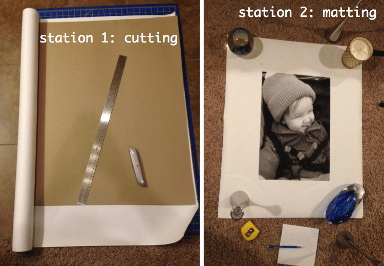Station 1 cutting supplies consisted of the paper roll, cutting mat, metal ruler, utility knife, and cardboard cut-out of desired paper size. (We cut two paper “mats” for each framed picture just to make sure it would be a solid white.)