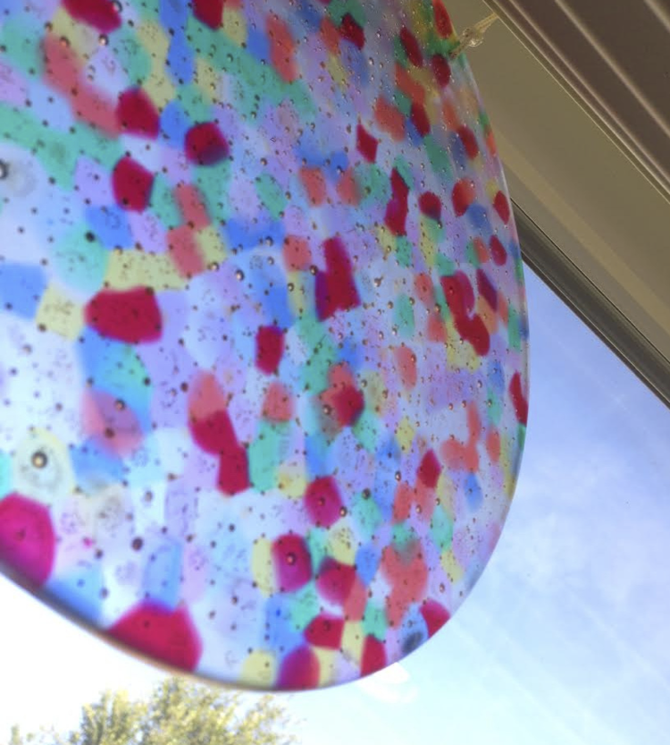 We hung up the large disk above the kitchen sink. It’s behind some blinds, but we can still easily see the colorful specs and Mya is proud of her “hard work.” Spoiler alert!: We decided to save the little sun catchers for Christmas ornaments, which we’ll add as gift toppers. Last year, Mya made these ornaments; and now we can check 2015’s handmade ornaments off the list!